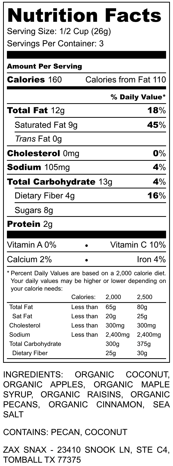 Cinnamon Apple is a melt-in-your-mouth combination of Organic Coconut, Green Apples, Raisins, Pecans, and Cinnamon with a buttery background of Organic Grade A Maple Syrup and Sea Salt