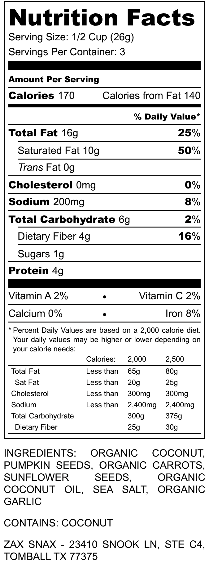 Crispy Garlic is a delicious blend of coconut, pumpkin and sunflower seeds, and carrots, all coated in coconut oil and garlic. A perfect alternative to potato chips, it's great right out of the bag or sprinkled on salads in place of croutons!