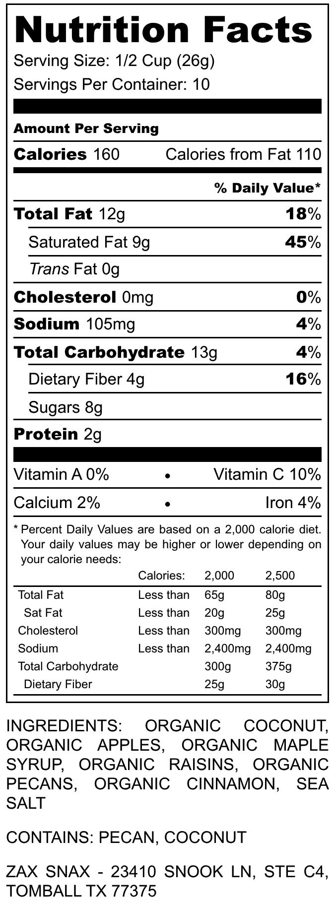 Cinnamon Apple is a melt-in-your-mouth combination of Organic Coconut, Green Apples, Raisins, Pecans, and Cinnamon with a buttery background of Grade A Maple Syrup and Sea Salt. The Party size is 3.3 times the size of our regular bags for a much better value on your Zax Snax.